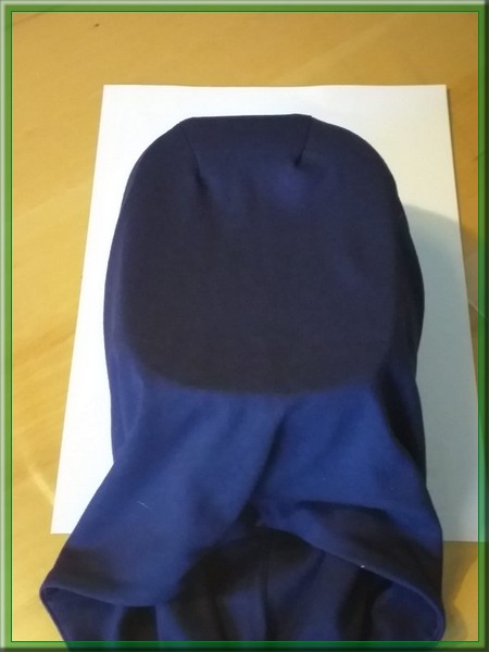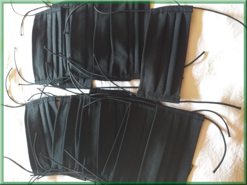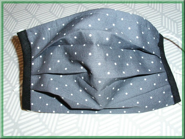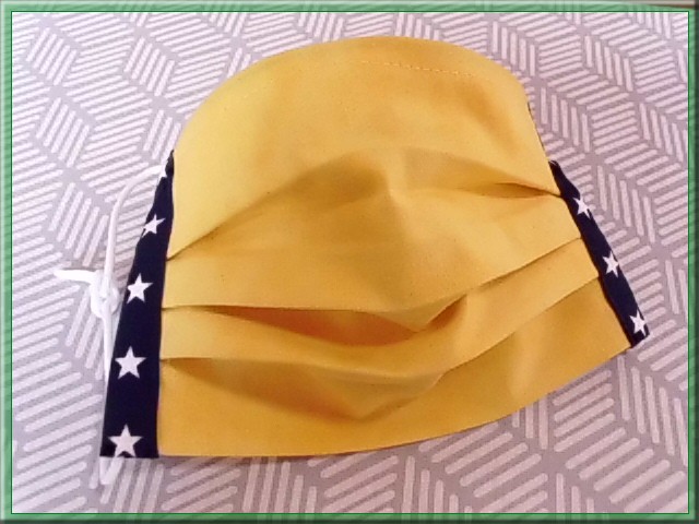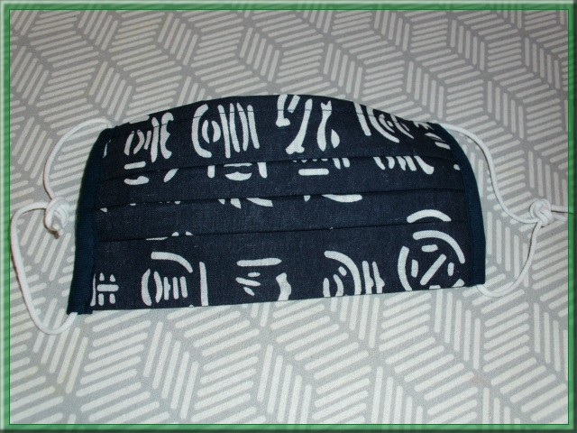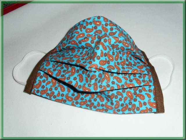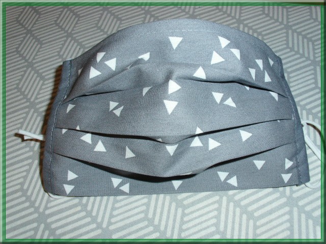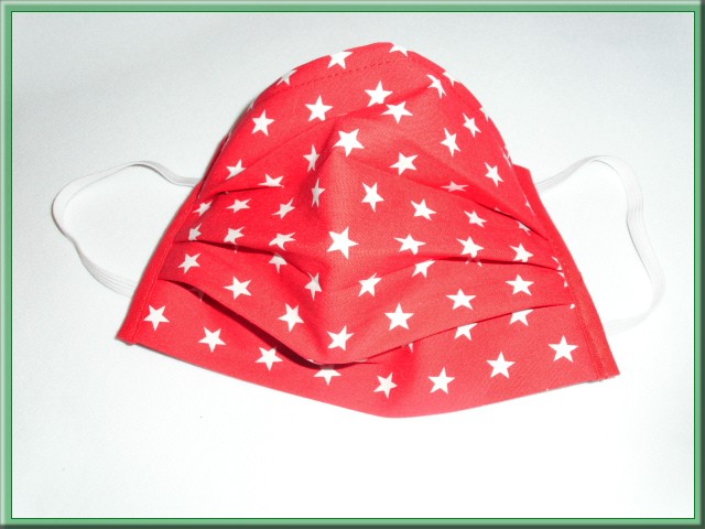 Selbstgenähte Maske mit Gummiband hinter den Ohren befestigen. Gummiband kann selbst angepasst werden.