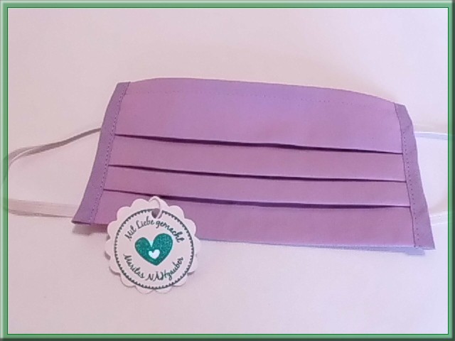 Selbstgenähte Maske mit Gummiband hinter den Ohren befestigen. Gummiband kann selbst angepasst werden. Eingearbeiteter Draht im Nasenbereich zur Anpassung. Die Maske ist zweilagig genäht.